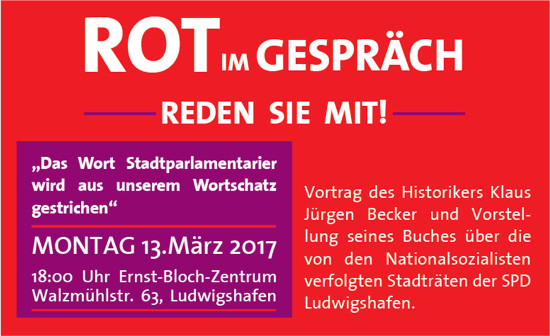 Mit der Machtergreifung der Nationalsozialisten 1933 begann für die große Mehrheit der demokratisch gewählten Amtsträger Ludwigshafens eine Leidenszeit. Verdrängung aus dem Beruf, öffentliche Verhöhnung, Drohungen, Verhaftungen, KZ-Einweisung, offene Gewalt und Mord kamen vor. Am 15. Dezember 2014 beschloss der Ludwigshafener Stadtrat einstimmig, mit einer Gedenktafel im Stadtratssaal an die Stadträtinnen und Stadträte zu erinnern, die Opfer der Nationalsozialisten wurden. Das Stadtarchiv arbeitete die Biographien außerdem in der Ende vergangenen Jahres erschienenen Studie „Das Wort Stadtparlamentarier wird aus unserem Wortschatz gestrichen“ auf.