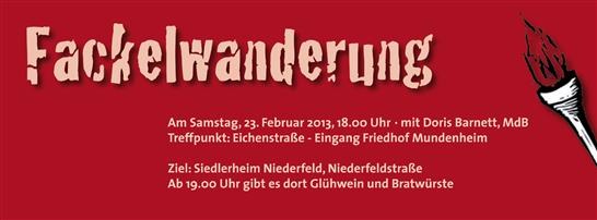 Eine gemeinsame Fackelwanderung bieten die Ortsvereine Gartenstadt und Niederfeld am Samstag, 23. Februar 2013, an. „Mit 100 Fackeln wird wieder der Weg durch die idyllische Gartenstadt in die Niederfeldsiedlung erhellt“, freut sich Andreas Rennig, der Ortsvereinsvorsitzende der Gartenstadt, auf das abendliche Lichterereignis. Mit dabei sind Doris Barnett, die Ludwigshafener Bundestagsabgeordnete sowie viele Kommunalpolitiker aus Ortsbeirat und Stadtrat.