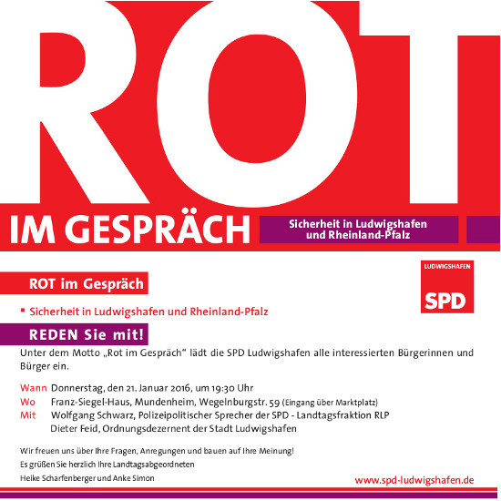 Unter dem Motto „Rot im Gespräch“ lädt die SPD Ludwigshafen alle interessierten Bürgerinnen und Bürger ein.