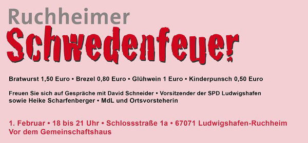 Einladung zum Ruchheimer Schwedenfeuer am 01. Februar 2015 ab 18 Uhr mit David Schneider, Vorsitzender der SPD Ludwigshafen, und Heike Scharfenberger, MdL und Ortsvorsteherin