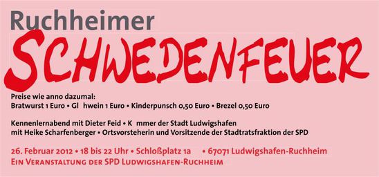 Am Sonntag, den 26.02.2012 um 18.00 Uhr veranstaltet der SPD-Ortsverein Ludwigshafen-Ruchheim das Ruchheimer Schwedenfeuer.