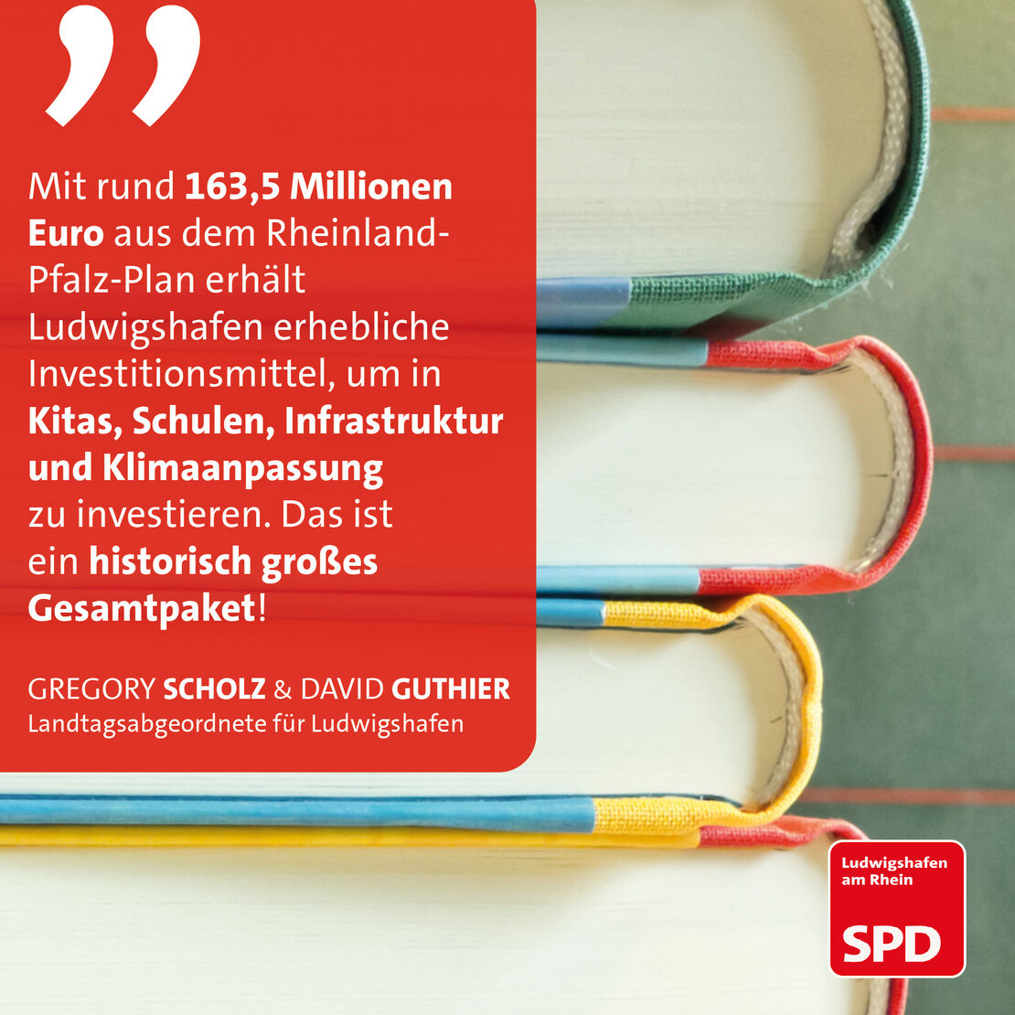 „Damit stärkt die Landesregierung mit Ministerpräsident Alexander Schweitzer an der Spitze die Handlungsfähigkeit unserer Stadt unmittelbar. Wir schaffen mit dem Sofortprogramm „Handlungsstarke Kommunen“ in 2025 und 2026 spürbare Entlastung im Haushalt mit insgesamt rund 47 Millionen Euro. Mit den rund 163,5 Millionen Euro aus dem Rheinland-Pfalz-Plan erhält Ludwigshafen darüber hinaus erhebliche Investitionsmittel, um in Kitas, Schulen, Infrastruktur und Klimaanpassung zu investieren. Das ist ein historisch großes Gesamtpaket“, erklären die SPD-Landtagsabgeordneten David Guthier und Gregory Scholz.