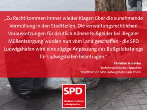 Bei Sperrmüll bis zu 2.500 Euro; bei Zigarettenkippen, Kaugummis, Kaffeebechern und Ähnlichem bis zu 250 Euro - das rheinland-pfälzische Umweltministerium hat jetzt die verwaltungsrechtlichen Voraussetzungen für deutlich höhere Bußgelder bei illegaler Müllentsorgung geschaffen. „Umgesetzt wird damit nun eine nachdrückliche Forderung der SPD Ludwigshafen, für die sich insbesondere Oberbürgermeisterin Jutta Steinruck sowie unsere Landtagsabgeordneten Anke Simon und Heike Scharfenberger in Mainz intensiv eingesetzt haben“, verdeutlicht der stellvertretende SPD-Fraktionschef Christian Schreider. Die SPD werde daher in der nächsten Sitzung des Hauptausschusses beantragen, dass die Stadtverwaltung zügig alle nötigen Schritte zur Umsetzung vor Ort und der entsprechenden Änderung des lokalen Bußgeldkatalogs einleitet.