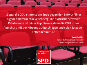 „Die plötzliche schwarze Kehrtwende ist reiner Populismus, denn die CDU ist im Ausschuss mit der Kürzung aufgeschlagen und spielt jetzt den Retter der Kultur“, kritisiert SPD-Fraktionschef David Guthier: „Das nenne ich scheinheilig!“ Dies gelte insbesondere auch vor dem Hintergrund, dass die CDU vor einem Jahr im Stadtrat eine moderate Erhöhung von Grund- und Spielhöllen-Steuer verhindert hat: „Schon damals haben wir der CDU die Gefahr aufgezeigt, dass sie damit einem Kahlschlag der Kultur in LU den Weg ebnet – genau so würde es mit dem bisherigen Haushaltsentwurf der CDU-Dezernentin Reifenberg jetzt auch kommen“, konstatiert SPD-Stadtrat Markus Lemberger. Daher werde die SPD bei den Haushaltsverhandlungen im Hauptausschuss deutliche Verbesserungen beantragen – und in sich in der Folge auch dafür einsetzen, „dass freie Kulturschaffende von der Verwaltung besser bei der Fördermittelakquise unterstützt werden“, so SPD-Kulturausschussmitglied Christian Schreider.