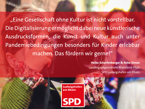 Der Kunstverein Ludwigshafen erhält im Rahmen des Kulturprogramms der Landesregierung eine Förderung in Höhe von 10.000 Euro. Die Unterstützung ist für die Kinder- und Jugendschule unARTig der Einrichtung in unserer Stadt und zwar zur Umsetzung von digitalen Projekten, informieren die beiden Ludwigshafener SPD-Landesabgeordneten Heike Scharfenberger und Anke Simon.