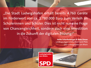 Für digitale Endgeräte stellt der Bund im Rahmen des Sofortausstattungsprogrammes, ergänzend zum DigitalPakt Schule, den Ländern Mittel zur Verfügung. Auf Rheinland-Pfalz entfallen hierfür 24,1 Millionen Euro, informieren die beiden Ludwigshafener SPD-Landtagsabgeordneten Heike Scharfenberger und Anke Simon. Das Antragsverfahren für die Anschaffung von Laptops und Tablets in Rheinland-Pfalz hat am 20. Juli 2020 begonnen, bereits Mitte August wurden von den Schulträgern knapp 4 Millionen Euro abgerufen und damit über 11.000 mobile Endgeräte bewilligt.