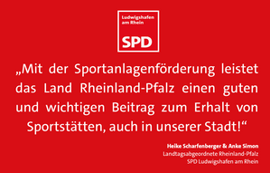 „Wir begrüßen und freuen uns über die finanzielle Förderung des Vereins für ihre Sportanlage am Heuweg. Mit der Sportanlagenförderung leistet das Land Rheinland-Pfalz einen guten und wichtigen Beitrag zum Erhalt von Sportstätten, auch in unserer Stadt“, so die beiden Ludwigshafener SPD-Landtagsabgeordneten Simon und Scharfenberger. Sport und Ehrenamt haben für unser Land und unsere Stadt auch eine große gesellschaftliche Bedeutung. Deshalb war und ist die Förderung von Sportanlagen ein wichtiges Ziel unserer sozialdemokratischen Politik.