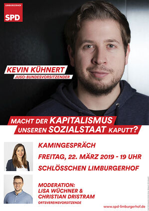 „Macht der Kapitalismus unseren Sozialstaat kaputt?“ Darüber diskutiert Kevin Kühnert im Kamingespräch am 22. März 2019 um 19 Uhr in Limburgerhof im Schlösschen, Parkstraße 43.