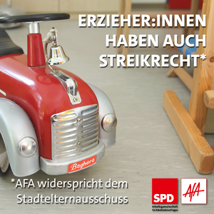Die Erzieher*innen gehen im Interesse der zu betreuenden Kinder auf die Straße und machen deutlich, wo die Politik im Interesse nachsteuern und mehr finanzieren muss als bisher. „Man kann nicht von Geiselhaft der Eltern sprechen, wenn die Arbeitnehmer*innen in den Kindertagesstätten für bessere Bedingungen für die Kinder eintreten und dies bei einem Streik auf der Straße deutlich machen“ so der AFA-Vorsitzende Holger Scharff.