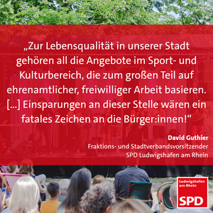 Der Fraktionsvorsitzende David Guthier ist ebenso überzeugt: „Zur Lebensqualität in unserer Stadt gehören all die Angebote im Sport- und Kulturbereich, die zum großen Teil auf ehrenamtlicher, freiwilliger Arbeit basieren. Um sie zu erhalten, muss die Förderung und Unterstützung durch die Stadt stabil bleiben. Einsparungen an dieser Stelle wären ein fatales Zeichen an die Bürger:innen!“