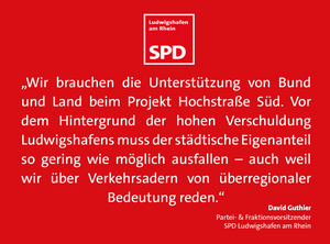Die SPD-Stadtratsfraktion unterstützt das Ziel von Oberbürgermeisterin Jutta Steinruck, die Finanzierung der Hochstraßenprojekte als Gesamtpaket mit Bund und Land zu verhandeln. Es sei gut, dass Bund und Land dazu ihre Bereitschaft signalisiert haben. Der städtische Eigenanteil für die Finanzierung beider Projekte müsse mit Blick auf die überregionale Bedeutung und die Verschuldung Ludwigshafens möglichst geringgehalten werden. Die Kritik der Linken und ihres Fraktionsvorsitzenden Ciccarello weist die SPD mit Nachdruck zurück.