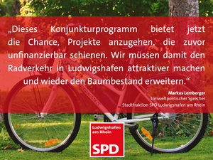 „Auch beim Klimaschutz besteht dringend Handlungsbedarf. In den letzten Jahren wurden in Ludwigshafen hunderte Bäume gefällt, aber nur ein ganz kleiner Teil nachgepflanzt. Hier besteht dringender Handlungsbedarf, der ebenfalls parteiübergreifend unstrittig ist. Mit diesem Konjunkturprogramm könnten wir dem entgegensteuern“, erklärt Lemberger. Leider gibt es nur eine sehr kurze Antragsfrist: Die erste endet bereits am 31. Oktober diesen Jahres. „Das zeigt die Dringlichkeit. Ich hoffe, dass die Verwaltung uns im August im Umweltausschuss bereits erste Ideen vorlegen kann, um sich an den Projekten des Bundes zu beteiligen. Wir sehen die Themen Radverkehr und Klimaschutz bei Alexander Thewalt in den besten Händen“, so Lemberger über den neuen Baudezernenten.