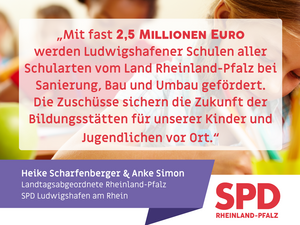 Scharfenberger: „Das Landesschulprogramm ist ein wichtiger Baustein zur Umsetzung geplanter Maß-nahmen an unseren Schulen und zum Erhalt des vielfältigen schulischen Angebotes bei uns in Lud-wigshafen. Damit stärken wir die Schullandschaft vor Ort und verbessern die Rahmenbedingungen. Dies kommt den Schülerinnen und Schülern sowie den Lehrerinnen und Lehrern zugute“.