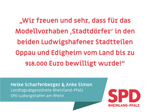 Für das Modellvorhaben „Stadtdörfer“ in den beiden Ludwigshafener Stadtteilen Oppau und Edigheim wurden vom Land RLP bis zu 918.000 Euro bewilligt. Diese Antwort erhielten die SPD-Landtagsabgeordneten Heike Scharfenberger und Anke Simon auf Anfrage vom Ministerium des Innern und Sport. Die Landeszuwendung dient zur Umsetzung der Leitbilder im Rahmen des aktuellen Durchführungskonzeptes des Modellvorhabens für die Jahre 2020 bis 2023. „Wir begrüßen und freuen uns über die Unterstützung der Landesregierung für diese Maßnahmen in unserer Heimatstadt Ludwigshafen“, so Simon und Scharfenberger.