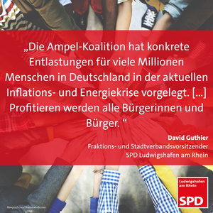 „Die Ampel-Koalition hat konkrete Entlastungen für viele Millionen Menschen in Deutschland in der aktuellen Inflations- und Energiekrise vorgelegt. Ich finde, das Ergebnis kann sich sehen lassen. Es zeigt: Die Bundesregierung ist handlungsfähig, die Koalition kann sich einigen und wird es auch im weiteren Verlauf der Krise immer wieder tun, um nachzusteuern“, erklärt der Vorsitzende der SPD Ludwigshafen, David Guthier.